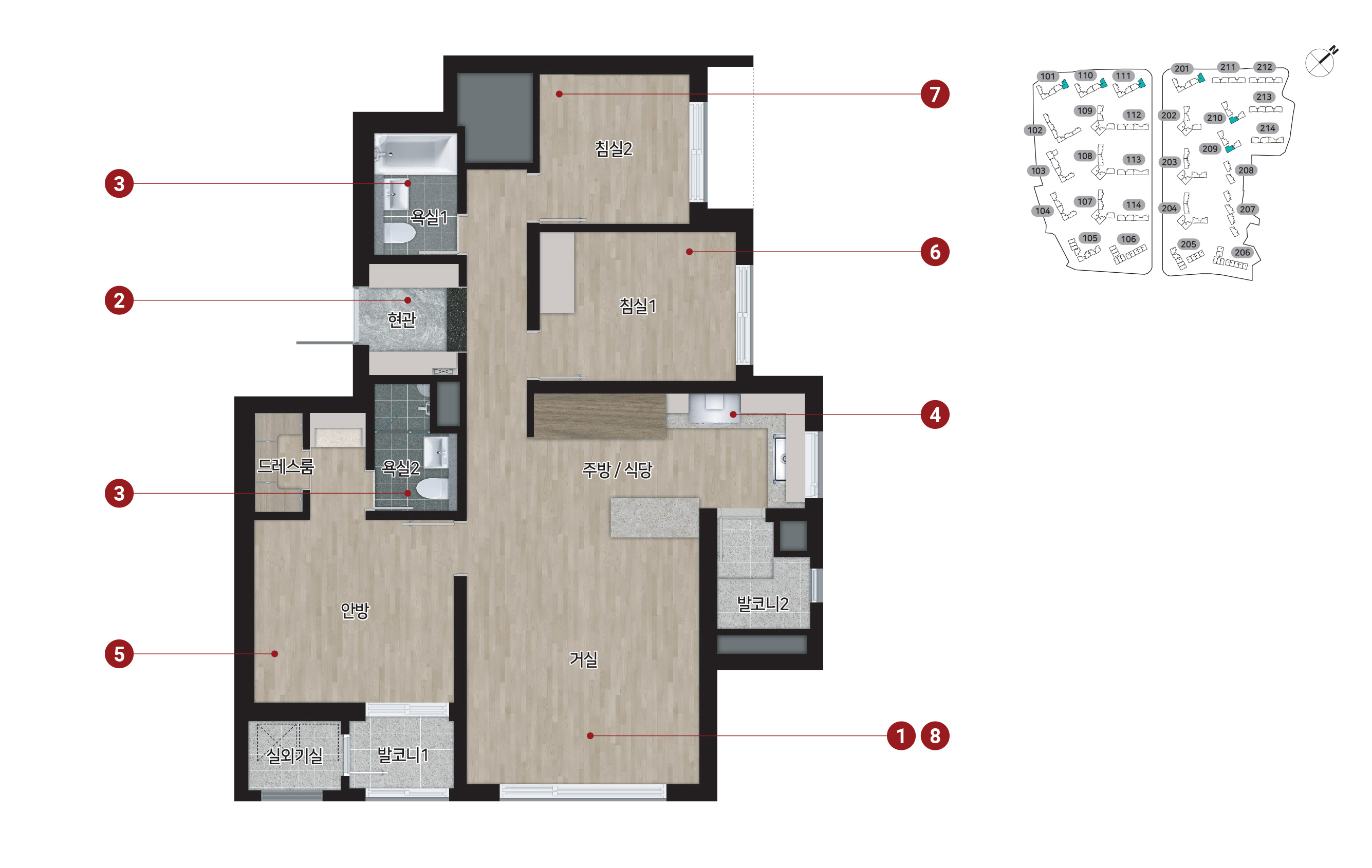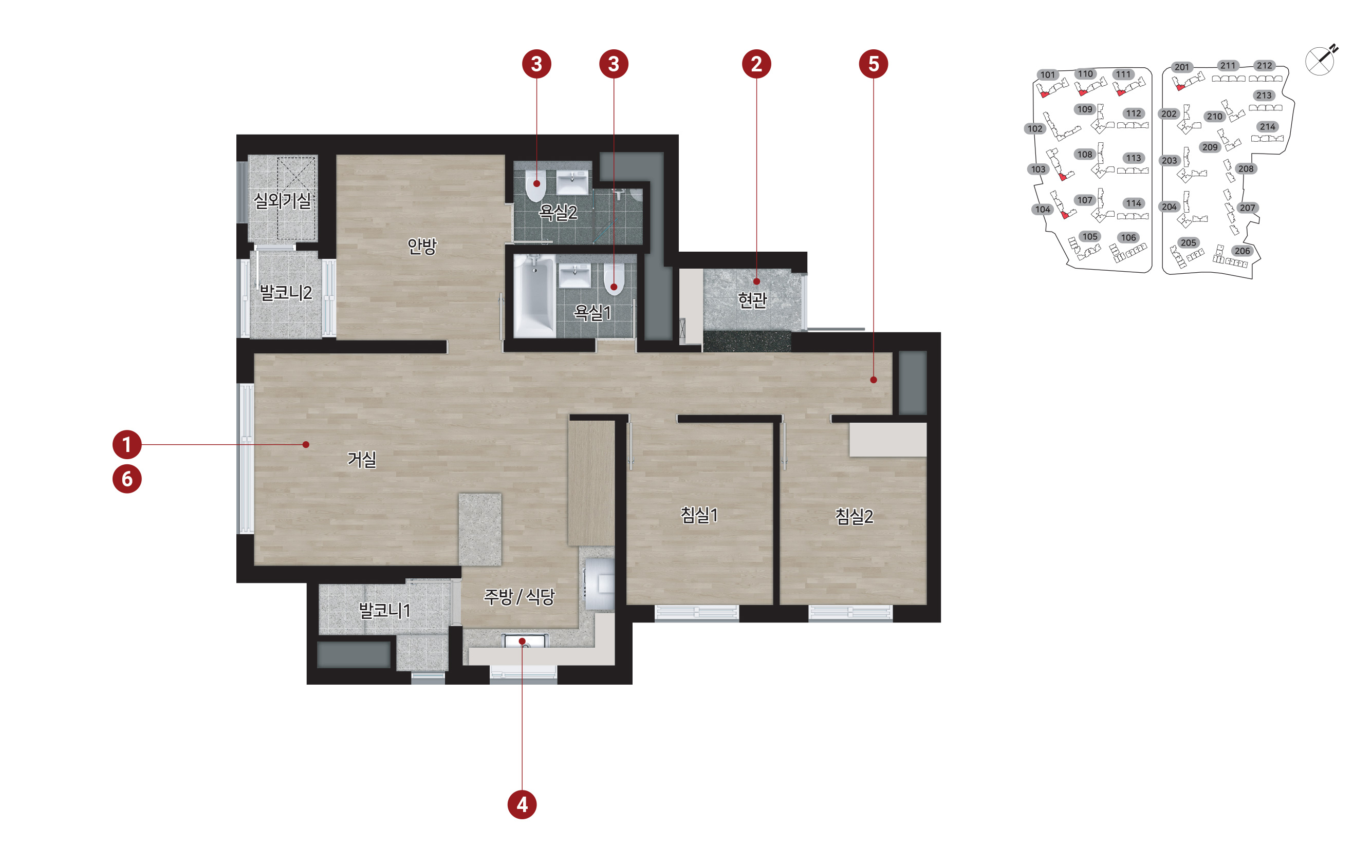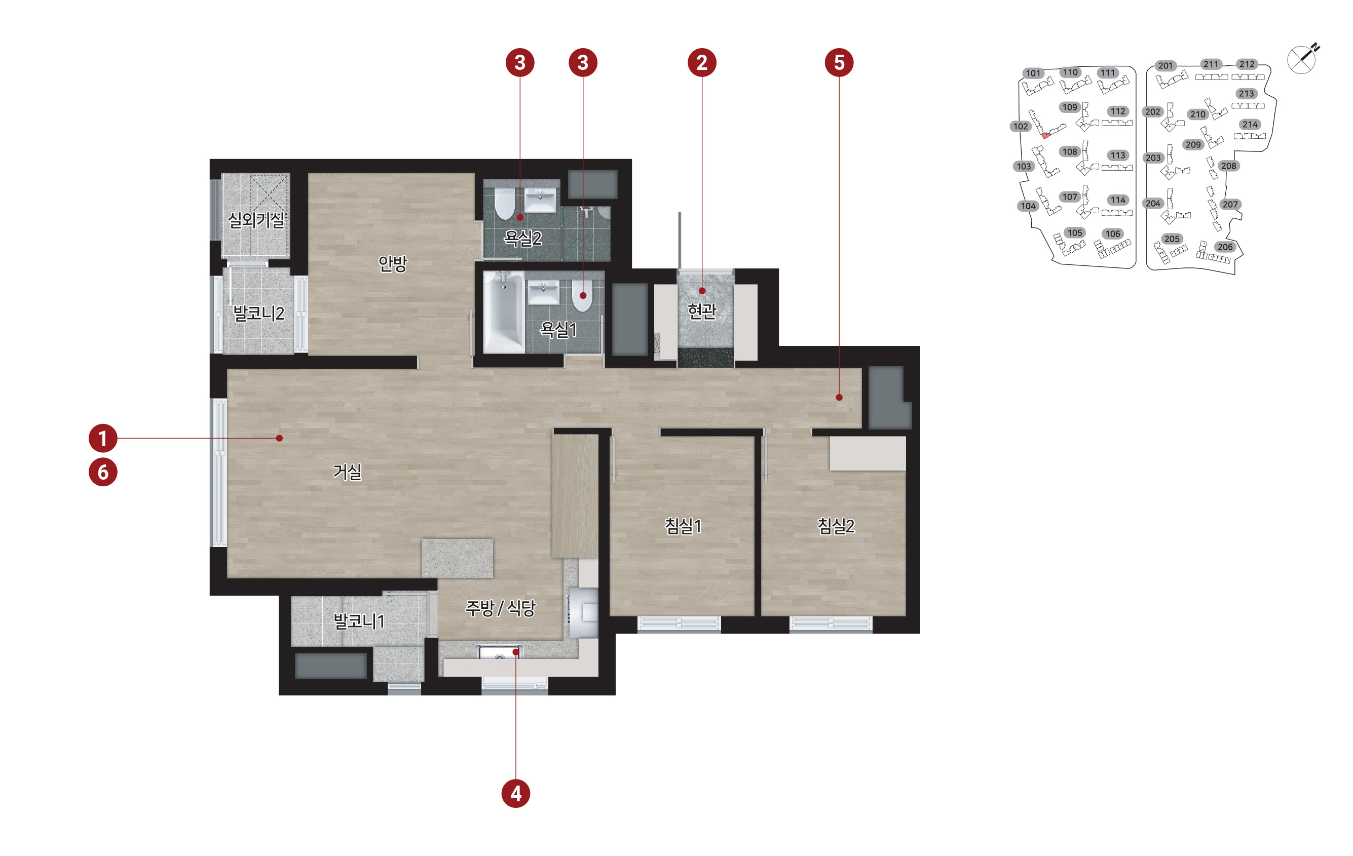 - 74㎡ 타입: 방3, 욕실2로 3~4인가구에 최적