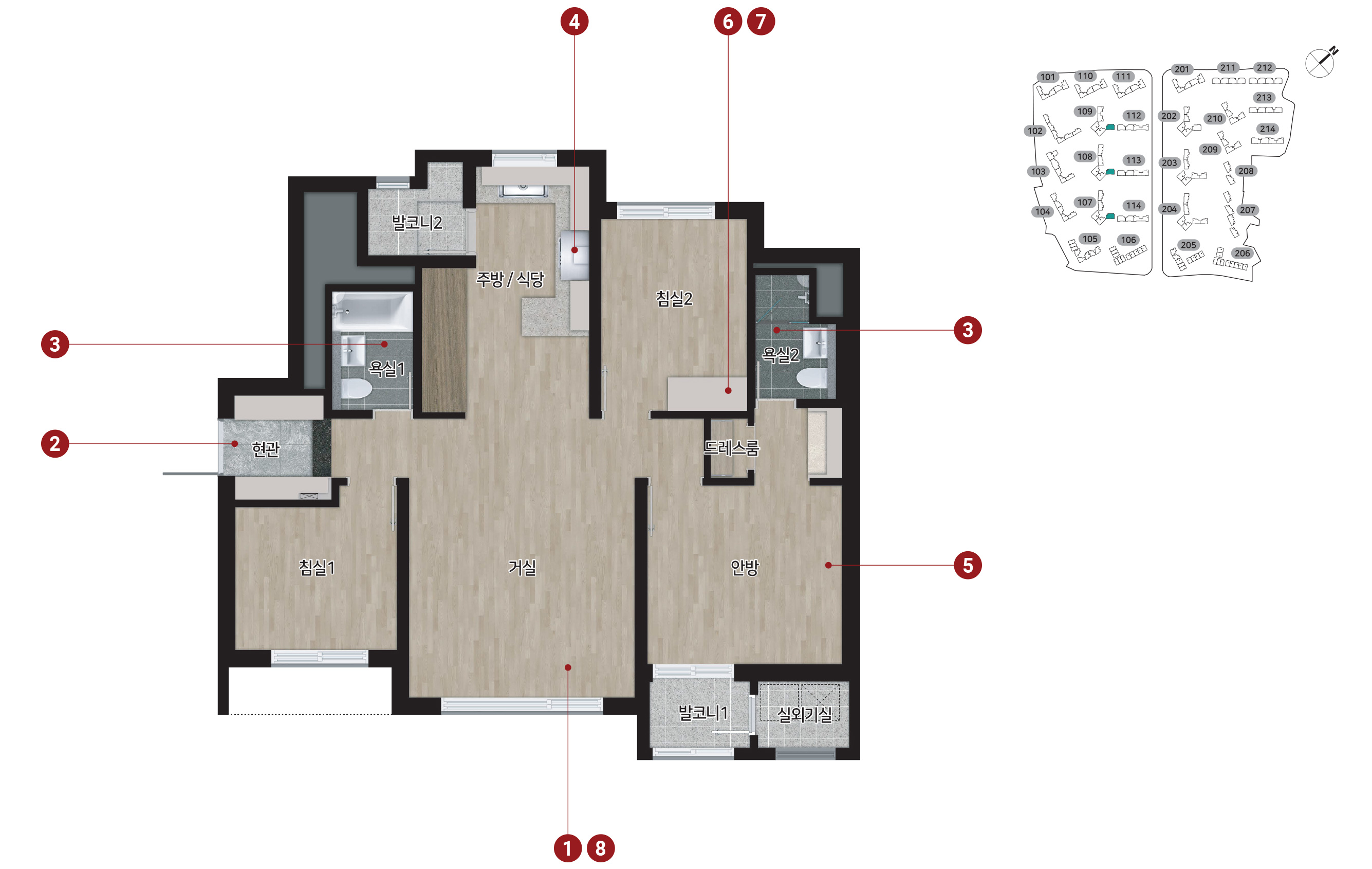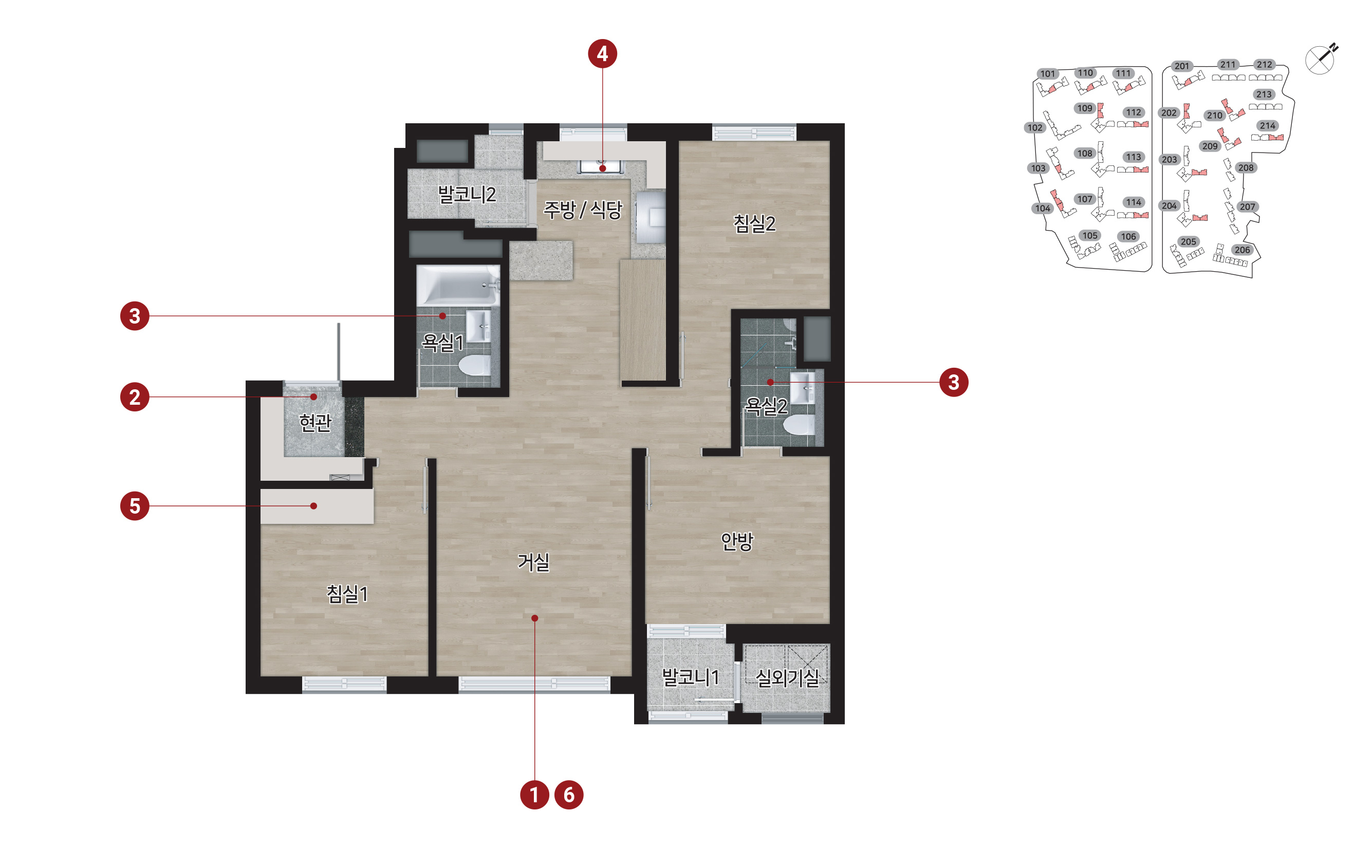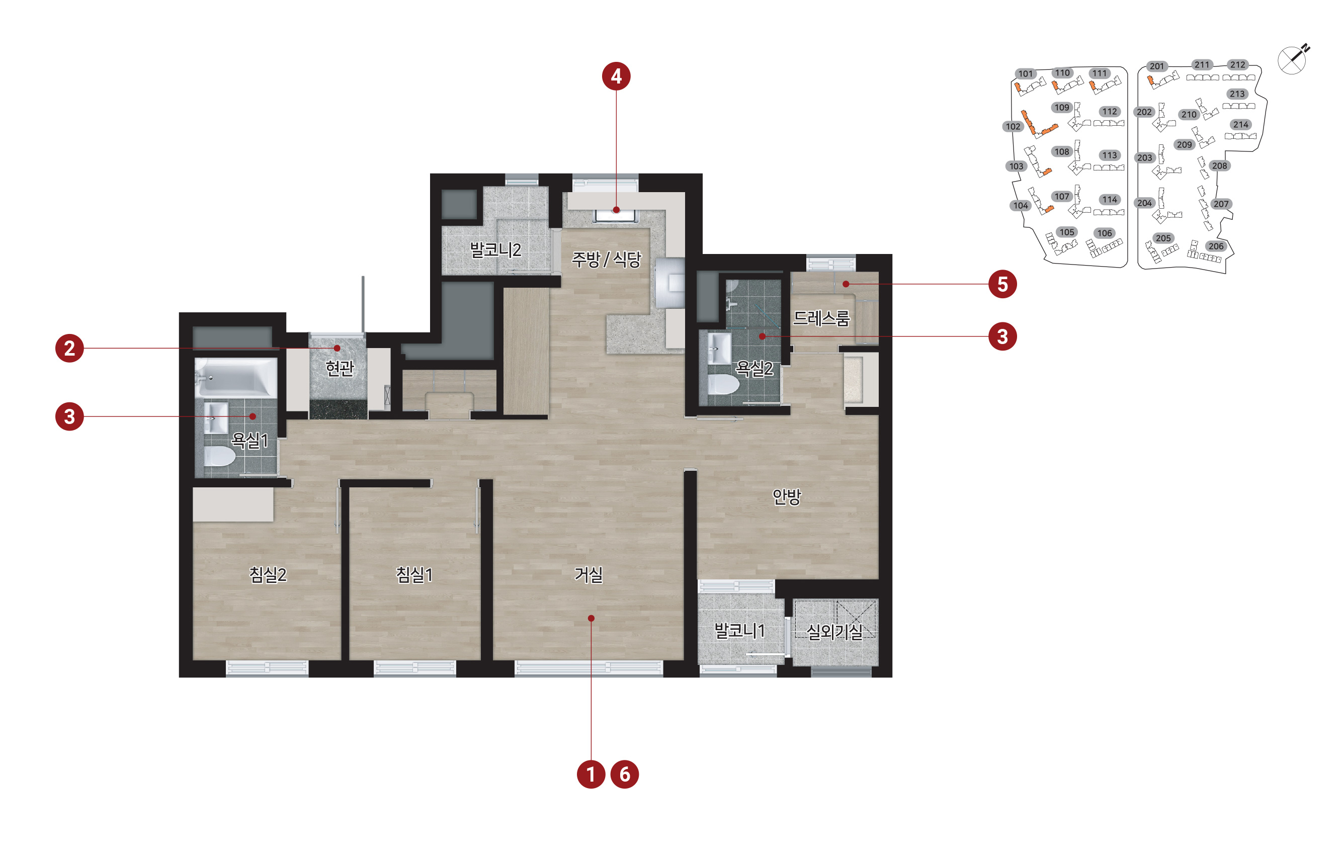 - 74㎡ 타입: 방3, 욕실2로 3~4인가구에 최적